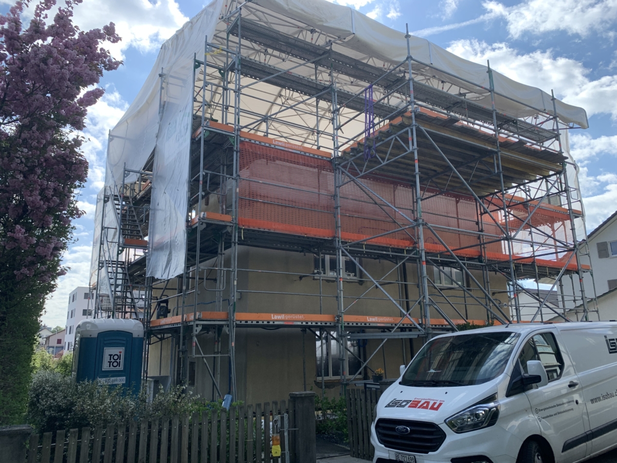 Als Nächstes folgen der netzarmierte Grundputz, der Deckputz sowie ein zweifacher Anstrich, die dem Gebäude nicht nur Schutz, sondern auch ein neues Erscheinungsbild verleihen.